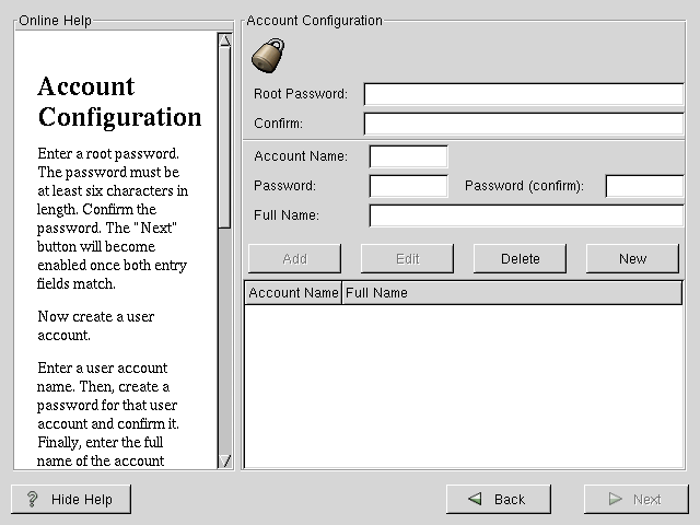 The Account Configuration screen allows you to set your root password. Additionally, you can set up user accounts for you to login to once the installation is complete (see Figure 4-13).