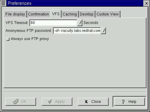 The GMC Preferences dialog is divided into Five major sections: File Display, Confirmation, VFS, Caching , Desktop, and Custom View.