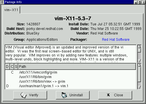If you're querying a package that's already installed, you'll also find two additional buttons beneath at the bottom of this window: Verify and Uninstall. If you're performing a query on a package that hasn't been installed yet, the buttons on the bottom will be labeled Install, Upgrade and Check Sig.